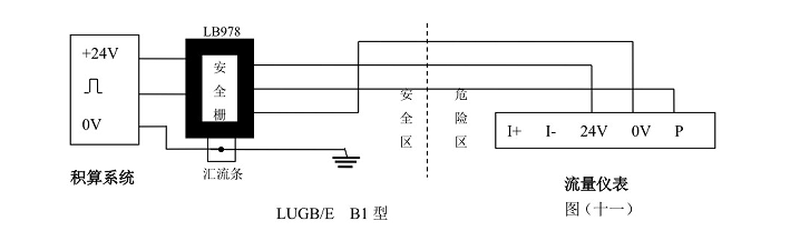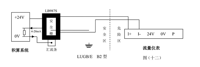 LUGB/E三線制脈沖輸出型渦街流量儀表與LB978齊納安全柵相連、LUGB/E兩線制標準4~20mA電流輸出型渦街流量儀表與LB987S齊納安全柵相連可構成本質安全型防爆系統(tǒng),產品防爆標志為Ex ia Ⅱ CT2-T5。本安防爆型渦街流量傳感器/變送器與防爆安全柵和積算系統(tǒng)等關聯(lián)設備的接線性請參看防爆安全柵廠家提供的接線說明和以下所示圖(十一),圖(十二)。