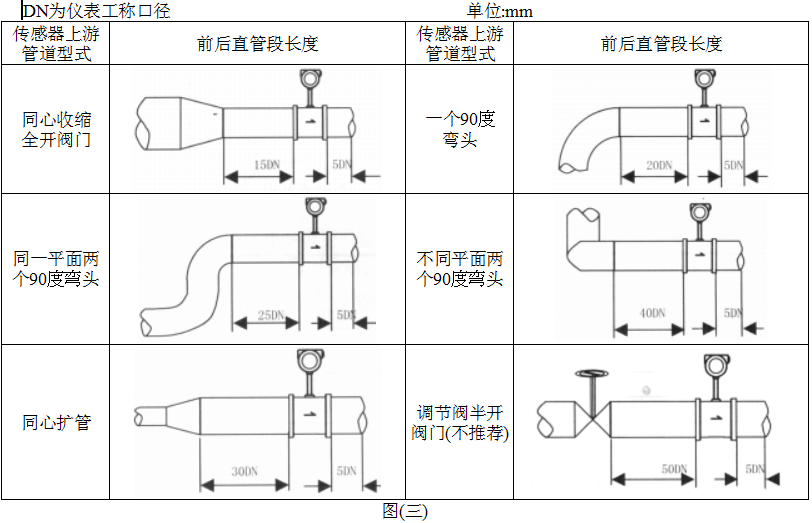 1. 渦街流量儀表對安裝點的上下游直管段有一定要求,否則會影響介質(zhì)在管道中的流場,影響儀表的測量精度。儀表的上下游直管段長度要求見圖(三)