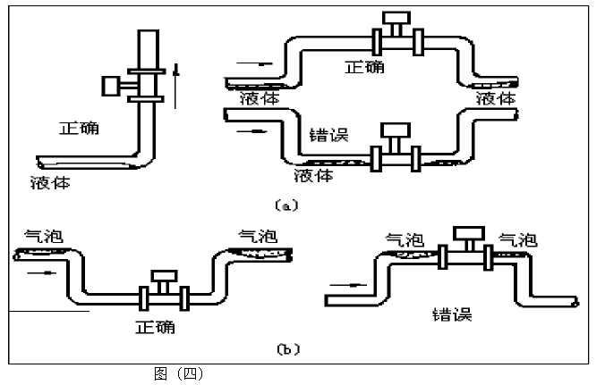 5. 測量氣體時,在垂直管道安裝儀表,氣體流向不限。但若管道內(nèi)含少量液體,為了防止液體進入儀表測量管,氣流應(yīng)自下而上流動,如圖(四)a所示
