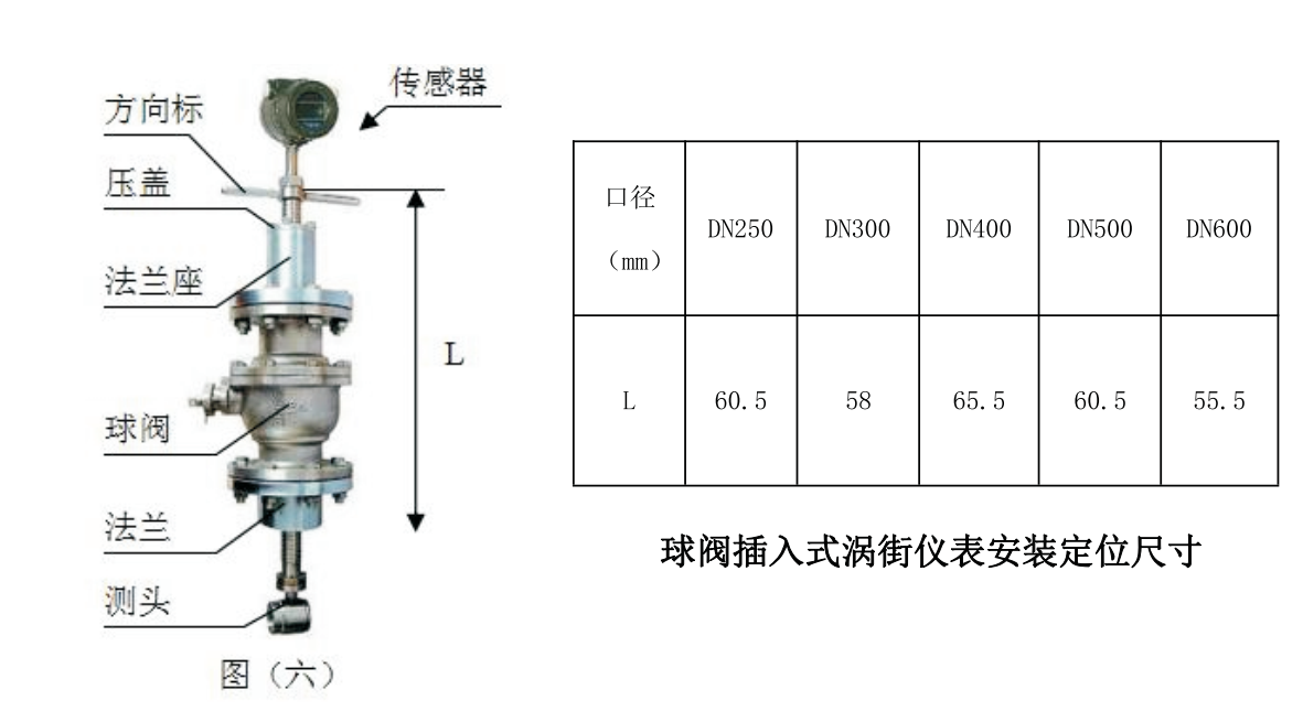 2.3將DN50球閥安裝到安裝底座上。注意球閥的長空腔向上,檢査球閥是否能全開全關(guān)。如有問題應(yīng)進行修理將壓緊螺紋座、壓緊螺母和橡膠密封圈安裝 到球閥上。松開定位螺釘和壓緊螺母,將傳感器插入桿通過球閥插入被測管道。插入 深度由H4計算,并由游標卡尺或鋼卷尺測量,符合要求后,上緊壓緊螺母和定位螺 釘,同時應(yīng)注意傳感器方向標志桿指向應(yīng)和流體流向一致